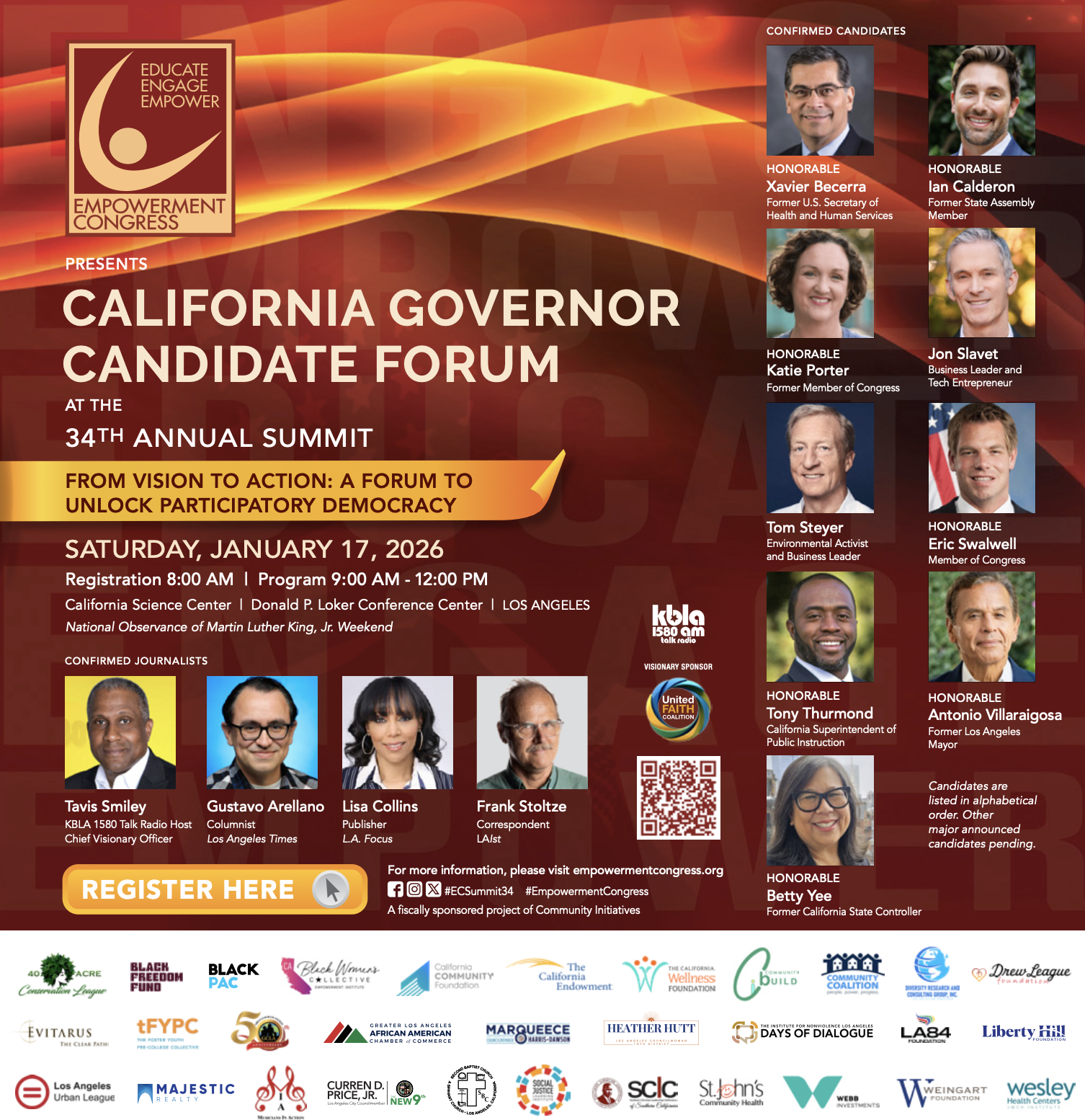 Sponsors for this year’s summit include the California Wellness Foundation, Charles R. Drew University, United Faith Coalition, the Weingart Foundation, KBLA, and the Greater Los Angeles African American Chamber of Commerce, underscoring the broad coalition invested in sustaining civic power and community leadership.